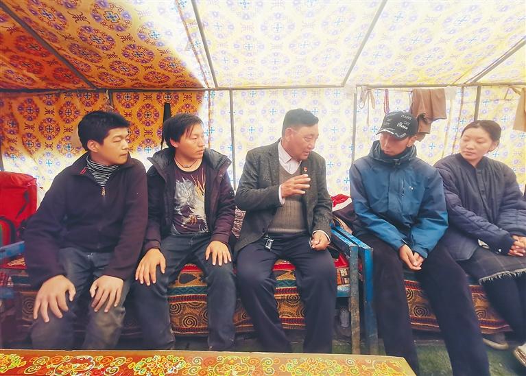圖為“全國模范人民調(diào)解員”扎西次加(中)在那曲市比如縣恰則鄉(xiāng)孔瑪奪村蟲草采集點向群眾宣講法律知識。
