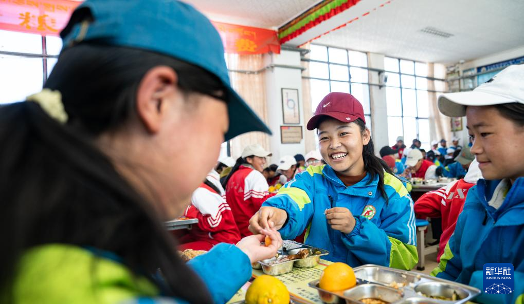 斯曲卓瑪(中)在學(xué)校吃午餐(11月10日攝)。新華社發(fā)(丁增尼達(dá) 攝)