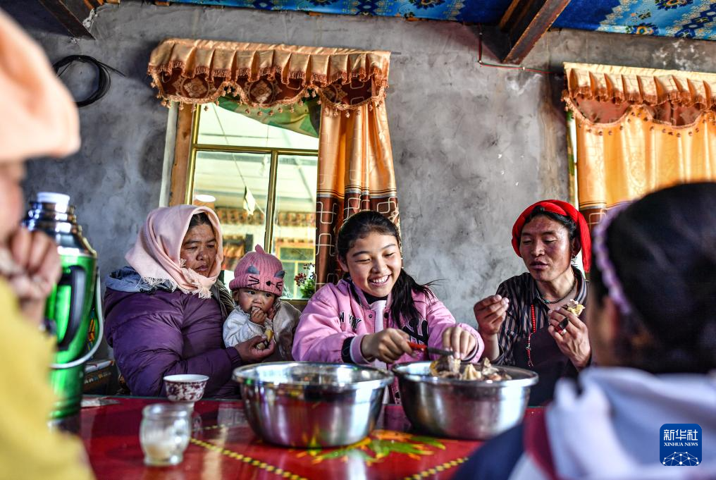 斯曲卓瑪(中)和家人一起吃飯(11月15日攝)。新華社記者 晉美多吉 攝