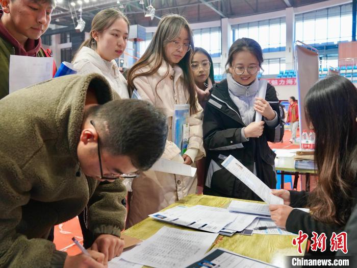 圖為招聘會現(xiàn)場,畢業(yè)生正在填寫信息?!⒀?攝