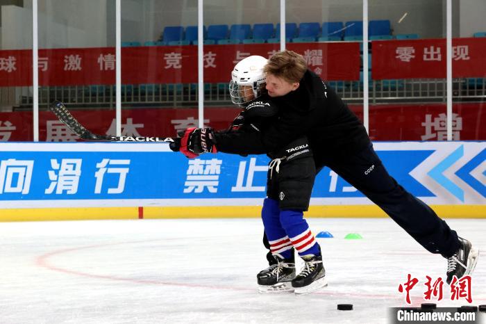 圖為外籍教練手把手教學冰球射門。薛蒂 攝