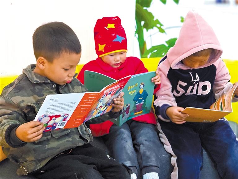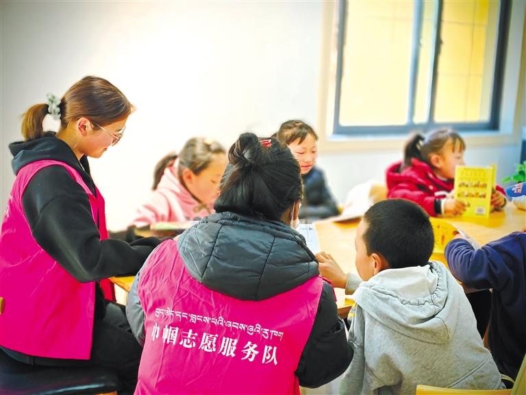 扎拉村的孩子在新時(shí)代文明實(shí)踐志愿服務(wù)隊(duì)成員的輔導(dǎo)下閱讀藏文繪本。