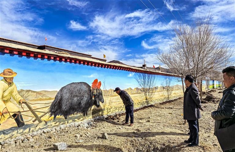 一幅幅栩栩如生的手繪墻畫,“爬上”了錯落有致的藏式小樓,“登上”了一座座藏式院落的院墻。從日喀則市桑珠孜區(qū)聶日雄鄉(xiāng)到東嘎鄉(xiāng)、曲美鄉(xiāng)到納爾鄉(xiāng),一幅幅手繪作品沿著鄉(xiāng)村主干道將一座座美麗鄉(xiāng)村串聯(lián)起來。