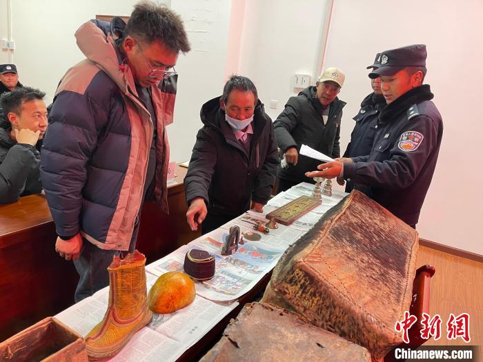 圖為2024年2月22日,錯(cuò)那警方將追回的文物返還給寺廟。(錯(cuò)那市公安局 供圖)