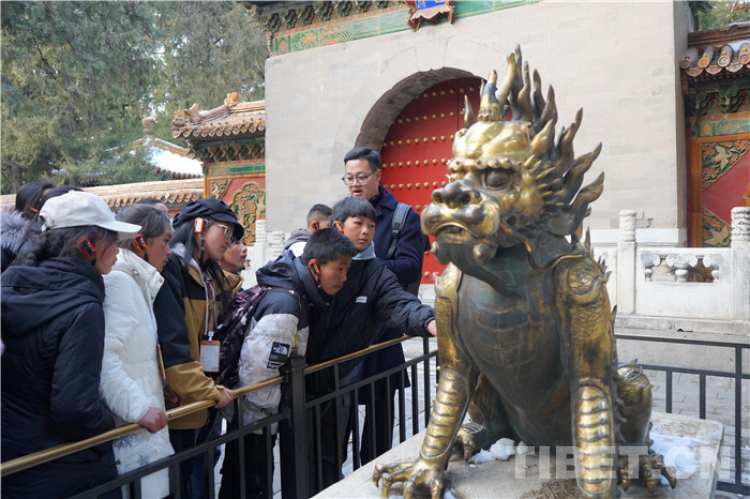 原來(lái)宮殿的排水系統(tǒng)既科學(xué)又美觀,原來(lái)屋脊神獸有避雷的作用,原來(lái)宮殿前的動(dòng)物造型香爐是古代版“舞臺(tái)干冰制造器”……故宮的建造元素如此豐富,來(lái)自各個(gè)地區(qū)和民族。隨著講解員的介紹,同學(xué)們被古人的智慧深深折服,對(duì)這座皇家園林有了了解和自己的認(rèn)識(shí)。站在宮殿的高處,學(xué)生們遙望到矗立的白塔,遙望到屋頂龍形裝飾的雨花閣,據(jù)說(shuō)里面都是清朝皇帝收藏關(guān)于藏傳佛教的“寶物”,那里有關(guān)于西藏的歷史故事。