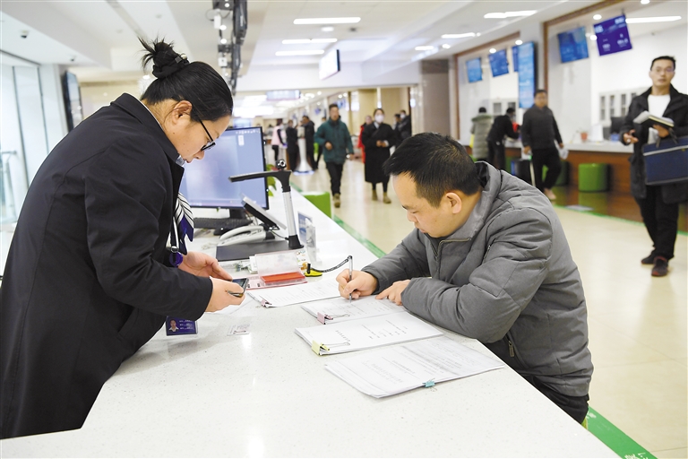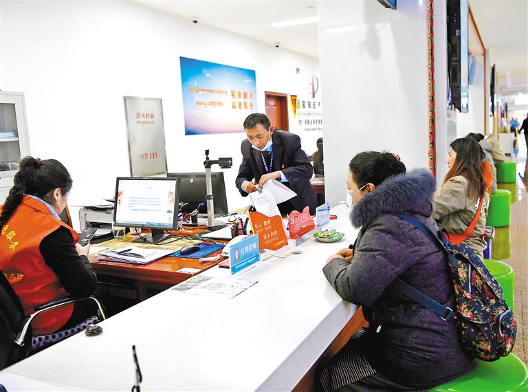 拉薩三級(jí)政務(wù)服務(wù)大廳窗口工作人員為市民群眾辦理相關(guān)業(yè)務(wù)。