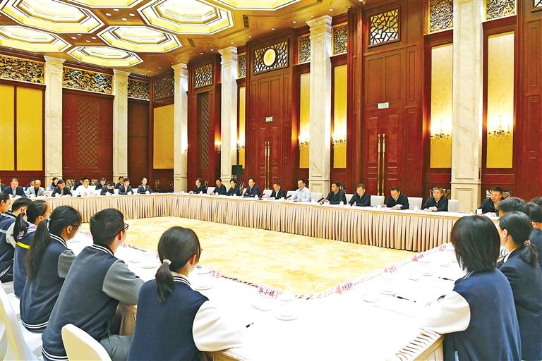 5月10日至11日,西藏自治區(qū)黨政代表團(tuán)赴上海學(xué)習(xí)考察。這是王君正看望西藏班師生、西藏籍高校畢業(yè)生就業(yè)代表,聽取他們?cè)谏虾W(xué)習(xí)、工作情況。 記者 李洲 攝