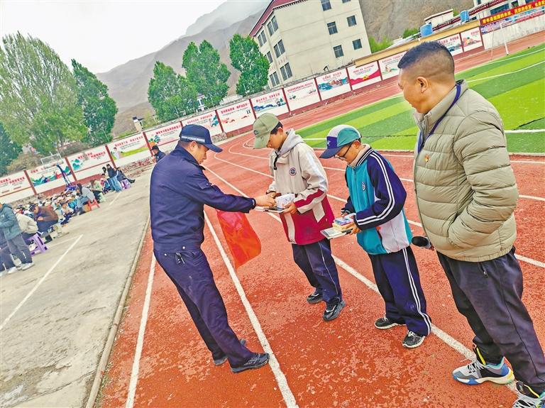 圖為民警為仁布縣中學(xué)兩名拾金不昧少年發(fā)放獎品。記者 彭琦 攝