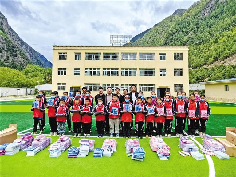 圖為林芝市紅十字會工作人員為八蓋鄉(xiāng)幼兒園捐贈學習用品。記者 胡文 攝