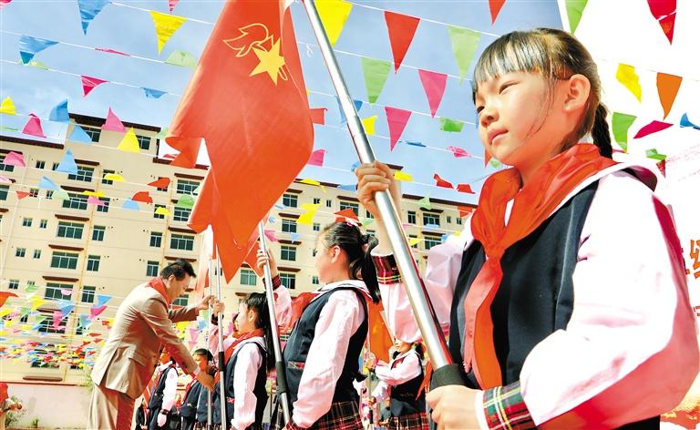 5月30日,拉薩市在實驗小學(xué)東城分校舉行以“紅領(lǐng)巾愛祖國”為主題的一年級新隊員入隊儀式暨“紅領(lǐng)巾獎?wù)隆蔽逍钦骂C章儀式。儀式現(xiàn)場,老隊員們鄭重地為新隊員佩戴紅領(lǐng)巾,大隊輔導(dǎo)員帶領(lǐng)新老隊員宣讀入隊誓詞,隊員們激情唱響《我們是共產(chǎn)主義接班人》,嘹亮的歌聲在校園回蕩。