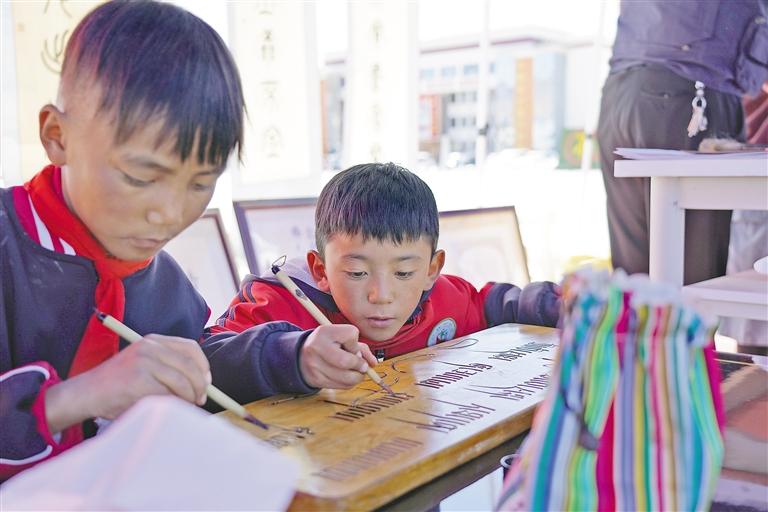 在阿里地區(qū)“文化和自然遺產(chǎn)日”活動中,小朋友學(xué)習(xí)藏文書法。記者 達(dá)珍 洛桑旦增 攝