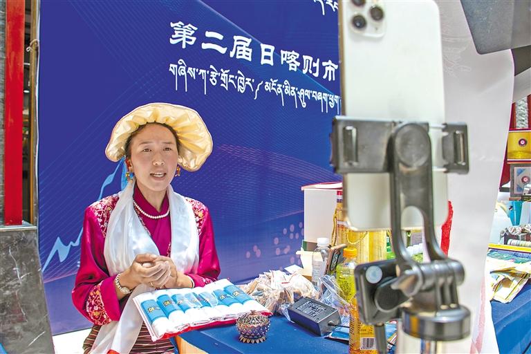 在日喀則市非遺展銷現(xiàn)場,主播通過直播為網(wǎng)友介紹非遺特產(chǎn)。記者 旦增嘎瓦 楊子彥 扎西頓珠 攝