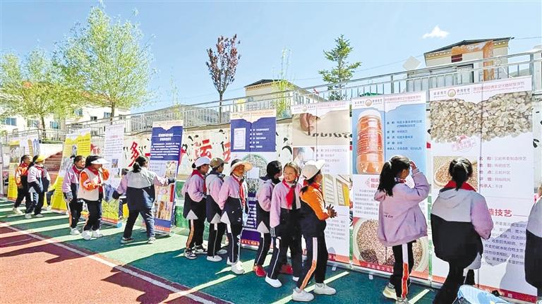 昌都市貢覺縣中心小學(xué)學(xué)生參觀非遺展板。記者 平措郎加 攝