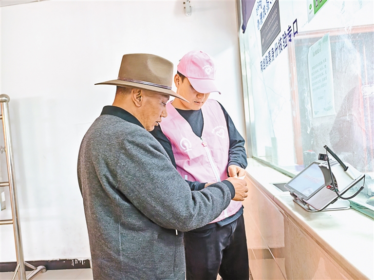 圖為志愿者幫助旅客確認(rèn)乘車(chē)時(shí)間。 通訊員 金耀勛 記者 盧文靜 攝