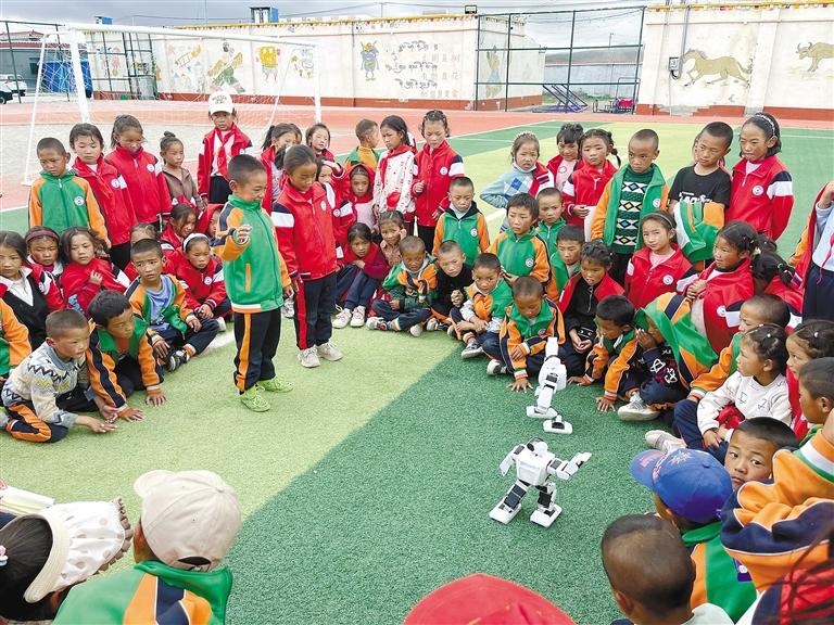 圖為阿里地區(qū)改則縣麻米鄉(xiāng)小學(xué)學(xué)生在觀看機器人表演。 王飛標(biāo) 記者 潘璐 攝