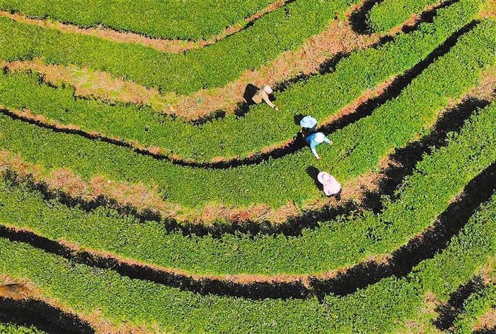 氣溫回暖,蟄伏了一個冬天的春茶早已迫不及待地吐出新綠。一片片小小的茶葉是村民手中的“金葉子”,一壟壟整齊的茶園成為當?shù)厝罕姷摹熬蹖毰琛保鼈儞纹鹆宿r(nóng)民增收、農(nóng)村富裕、脫貧攻堅的一方天地。