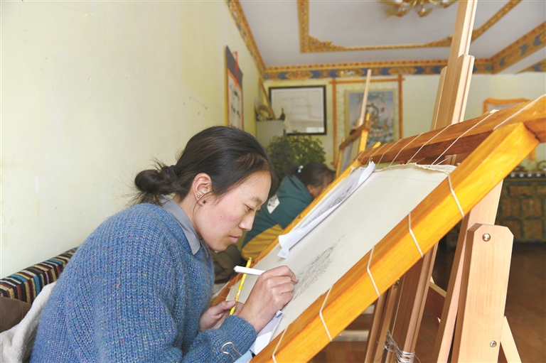 西藏雪堆白傳統(tǒng)手工藝術(shù)學(xué)校創(chuàng)辦至今已有十個(gè)年頭。作為學(xué)校目前最成熟、最系統(tǒng)化的專業(yè),唐卡繪畫專業(yè)吸引了許多前來學(xué)藝的農(nóng)牧民子女和社會(huì)人士。