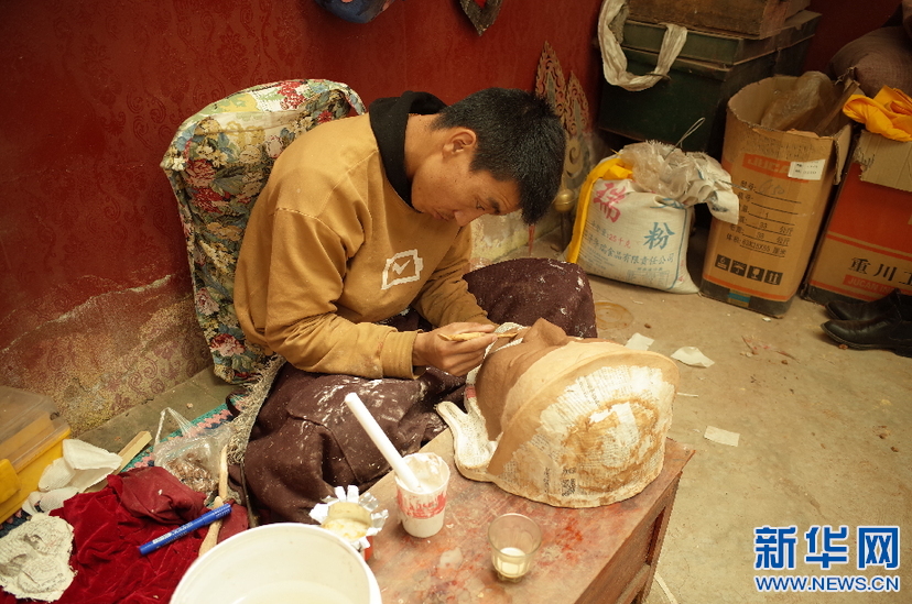 在西藏拉薩市達孜區(qū),西洛的學徒旦增扎西在給面具塑形(5月15日攝)。新華社記者 格桑邊覺 攝