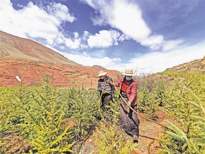 西藏昌都市丁青縣覺恩鄉(xiāng)絨通村苗木種植項目總投資2000萬元,采取“公司+基地+農戶”的運作模式。2018年底,基地開工建設,93戶農戶以每畝每年1000元的價格參與500畝的土地流轉,項目實施階段共計880人次的貧困戶參與了務工。至2019年6月,已成功栽下云杉、昌都楊、柳樹、榆樹4個品種,共計97萬株樹苗。目前,在基地長期務工的村民有8名,年收入近2萬元。