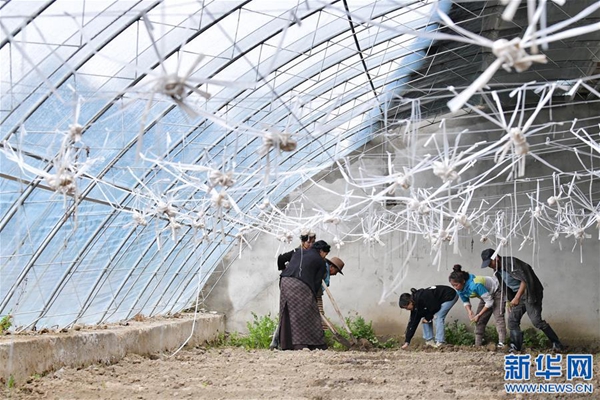格桑旺姆(右三)與姐姐德吉卓瑪(右二)帶領工人在蔬菜大棚內翻地,準備種新的蔬菜(8月3日攝)。