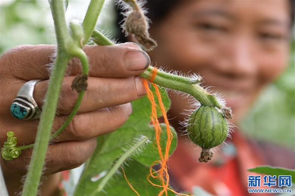 格桑旺姆姐妹家大棚內的瓜秧上結出的小西瓜(8月2日攝)。