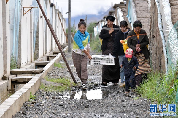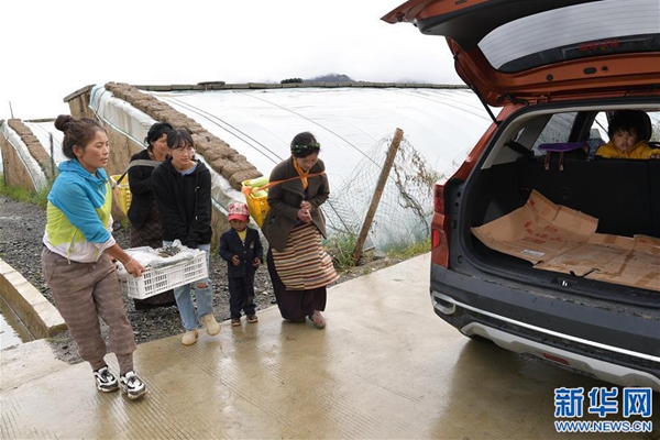 格桑旺姆(左三)和姐姐德吉卓瑪(左一)帶領雇傭的殘障村民巴珍(右一)搬運大棚出產的新鮮蔬菜(8月3日攝)。