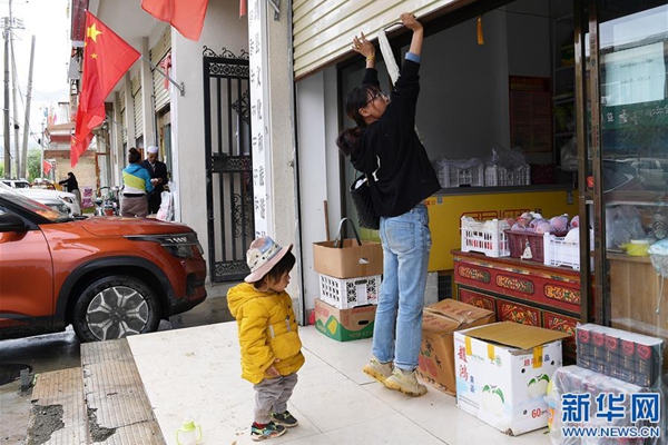 格桑旺姆推開蔬菜店的卷閘門準備營業(yè)(8月3日攝)。