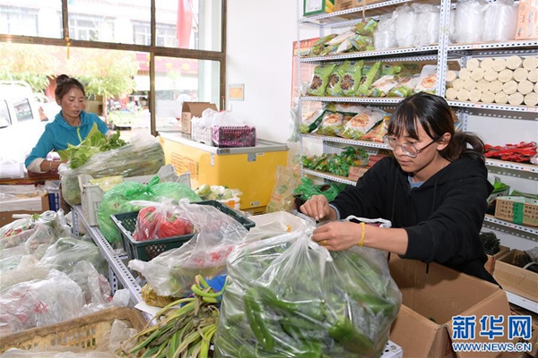 格桑旺姆(右)和姐姐德吉卓瑪在位于白朗縣的蔬菜店內忙碌(8月3日攝)。