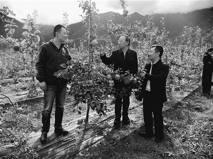 國(guó)家蘋果產(chǎn)業(yè)技術(shù)體系首席科學(xué)家霍學(xué)喜(中)在米林縣羌納蘋果示范基地現(xiàn)場(chǎng)開展技術(shù)指導(dǎo)。西藏日?qǐng)?bào)記者 李梅英 攝