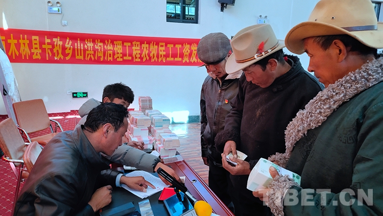 圖為西藏自治區(qū)日喀則市南木林縣卡孜鄉(xiāng)山洪溝治理工程項(xiàng)目民工工資發(fā)放暨勞務(wù)合作社分紅儀式現(xiàn)場