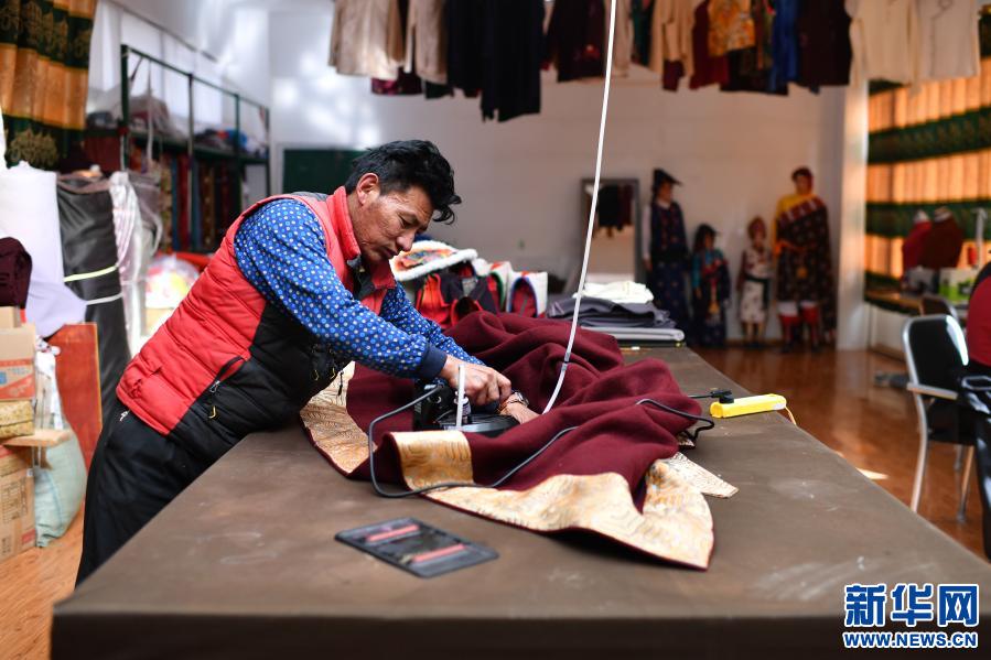 在西藏昌都市江達縣格?;褡宸椉庸やN售公司,江達縣字嘎鄉(xiāng)塔字村村民扎西江措在制作藏裝(4月30日攝)。扎西江措學(xué)習(xí)制作藏裝不到兩年時間,已經(jīng)是一名熟練的制衣工,現(xiàn)在每個月有4000多元的收入。新華社記者 詹彥 攝