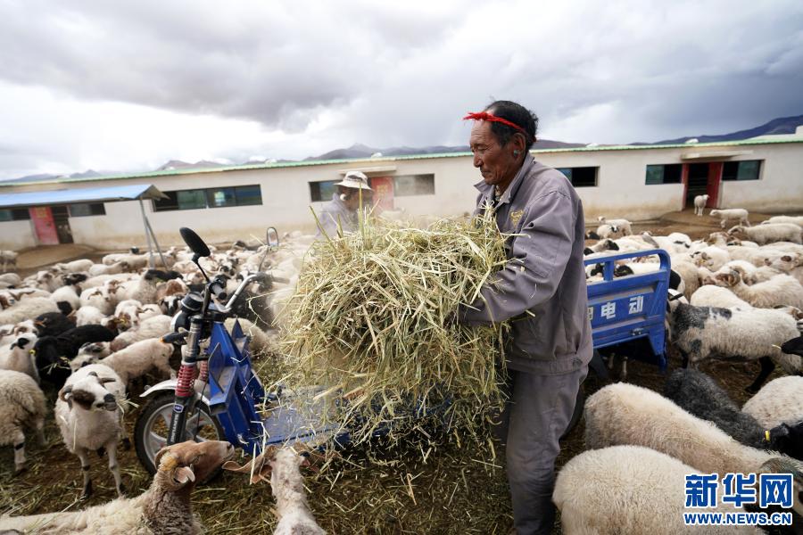 西藏日喀則市定日縣克瑪鄉(xiāng)幫布村村民頓珠在定日縣珠穆朗瑪崗巴羊規(guī)?;B(yǎng)殖產(chǎn)業(yè)園喂羊(7月31日攝)。頓珠2020年來到產(chǎn)業(yè)園打工,負責(zé)喂羊、打掃羊舍,每個月有3500元的收入。新華社記者 詹彥 攝