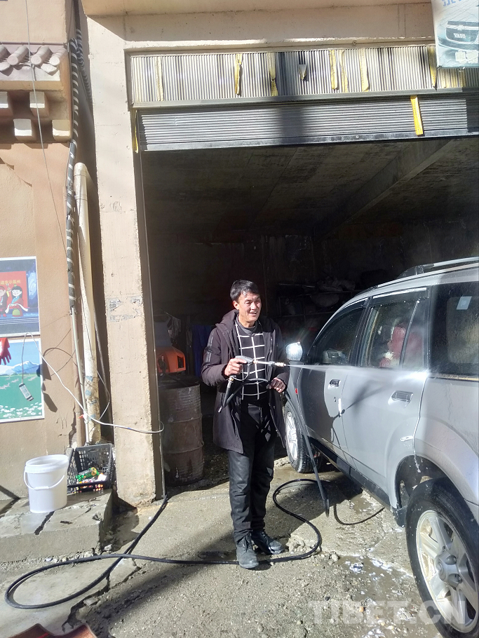 圖為降央多丁正在洗車(chē)