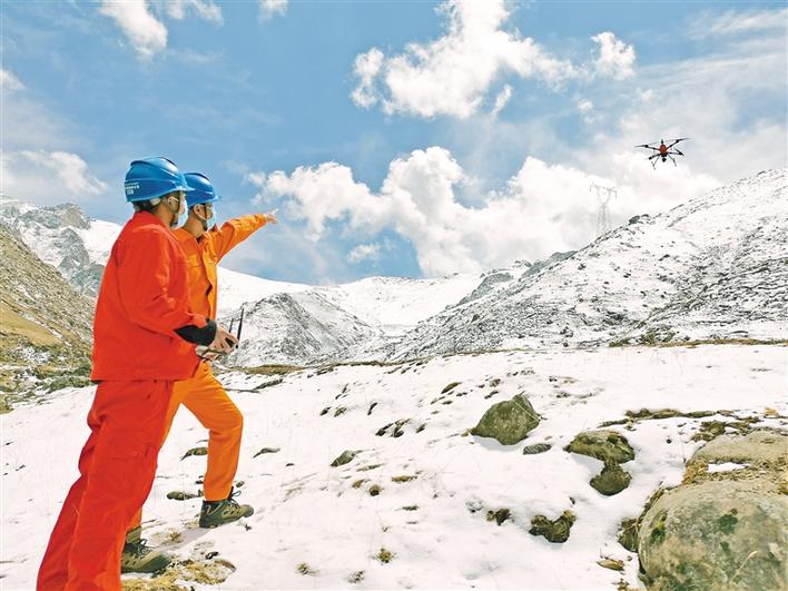 圖為國網西藏電力有限公司檢修公司兩名員工用無人機巡視220千伏墨山線。 王嘯天 記者 拉巴桑姆 攝