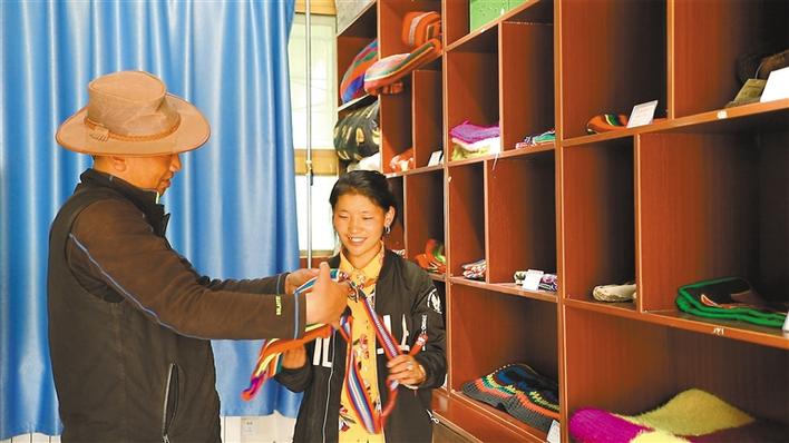 圖為在措勤縣民族特色產(chǎn)業(yè)線下體驗(yàn)館工作的貧困戶頓珠(右)為顧客推介當(dāng)?shù)禺a(chǎn)品。記者 溫凱 洛桑旦增 攝