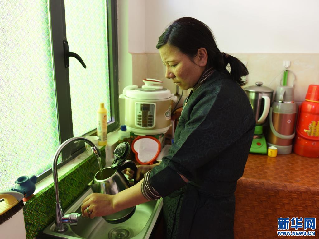 森布日極高海拔生態(tài)搬遷安置點內(nèi),村民次仁卓嘎終于在家里用上了自來水(2020年1月12日攝)。新華社記者 田金文 攝