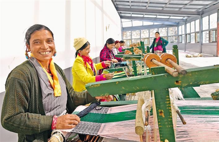 吉隆縣吉隆鎮(zhèn)的達(dá)曼人普布曲宗在合作社從事編織工作。