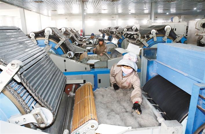 當(dāng)?shù)厝罕娫诶_市達(dá)孜工業(yè)園生產(chǎn)車間加工羊毛。