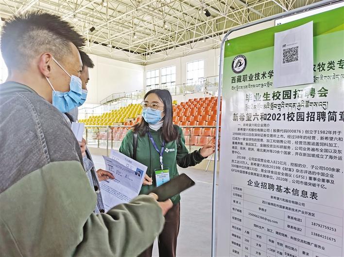 圖為西藏職業(yè)技術(shù)學院2021屆農(nóng)牧類專業(yè)畢業(yè)生校園招聘會現(xiàn)場,新希望六和股份有限公司工作人員向?qū)W生介紹招聘信息。記者 王莉 攝