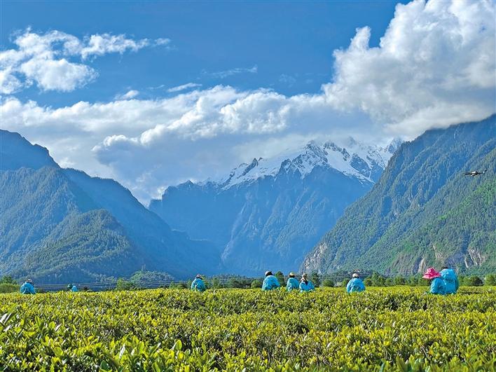 天朗氣清,茶韻悠悠。西藏林芝波密縣易貢茶場(chǎng)里,油菜花開(kāi)得正艷;廣袤的湖畔牧場(chǎng)上,馬牛成群;茶農(nóng)們穿梭在茶林間,他們身挎茶簍,兩手并用,掐準(zhǔn)“一葉一茶”,快速放入簍里,舉手低頭間,茶簍逐漸被裝滿。