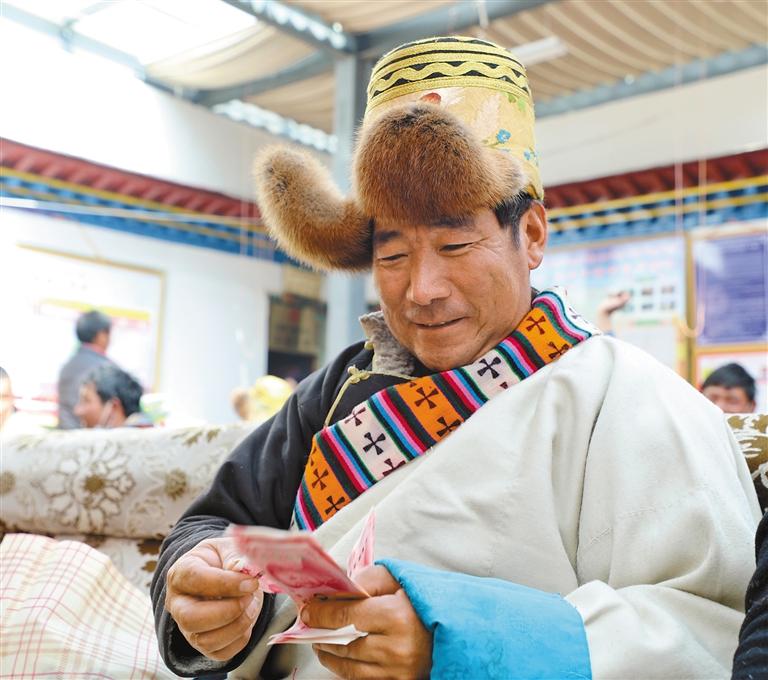 圖為崗西村群眾普瓊拿到合作社分紅時(shí)的情景。記者 張斌 通訊員 格桑羅布 攝