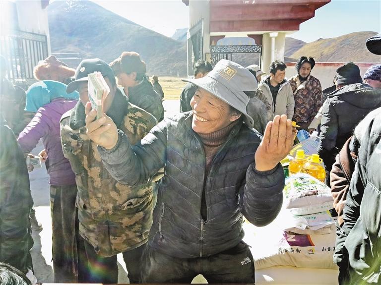 圖為嘉黎縣夏瑪鄉(xiāng)坡爾倉村村民洛桑拿到分紅后,喜笑顏開。 記者 萬靖 攝