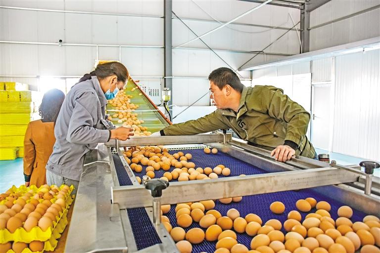 圖為就業(yè)群眾和技術(shù)員在西藏宏農(nóng)百萬羽全智能化藏雞產(chǎn)業(yè)園的流水線上篩檢成品雞蛋。 記者 劉楓 攝