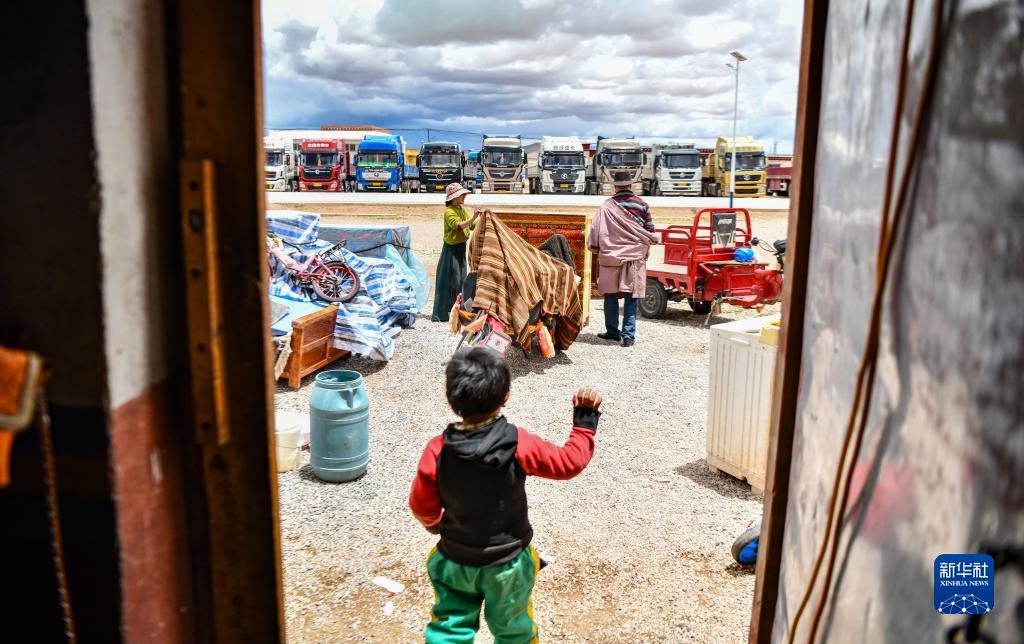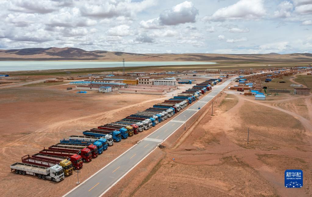 在雙湖縣多瑪鄉(xiāng)仲魯瑪村,運輸家具的貨車整裝待發(fā)(7月13日攝,無人機照片)。新華社記者 晉美多吉 攝