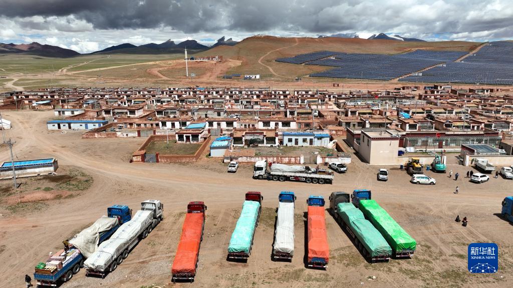 運輸家具的貨車在雙湖縣多瑪鄉(xiāng)果根擦曲村集合(7月12日攝,無人機照片)。新華社記者 晉美多吉 攝