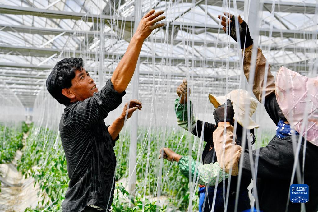 戴著遮陽帽,一邊修剪辣椒枝條,一邊系繩吊枝,兩三人搭檔,有說有笑。這是記者在西藏山南市瓊結(jié)縣千畝蔬菜基地看到的場景。