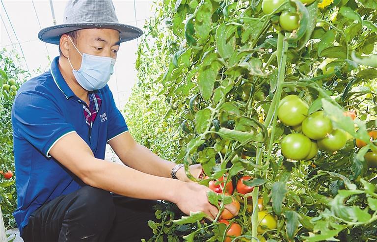圖為日喀則市白朗縣七彩莊園生態(tài)農(nóng)業(yè)公司工作人員在溫室大棚內(nèi)釆摘西紅柿。記者 洛桑 攝