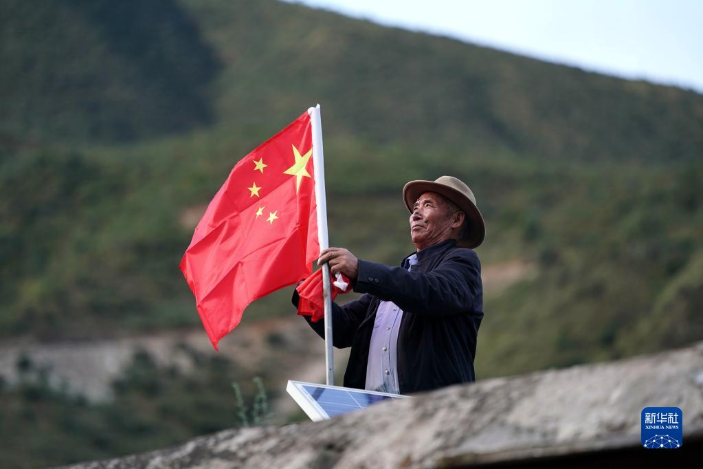 昌都市江達縣崗?fù)写宕迕衿瞻驮谖蓓敁Q上嶄新的國旗(2020年9月25日攝)。新華社記者 詹彥 攝