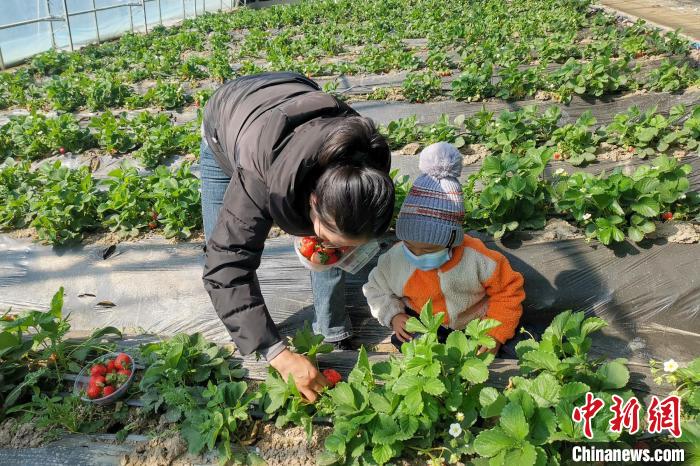 家長帶孩子體驗(yàn)草莓采摘?!堄裣?攝