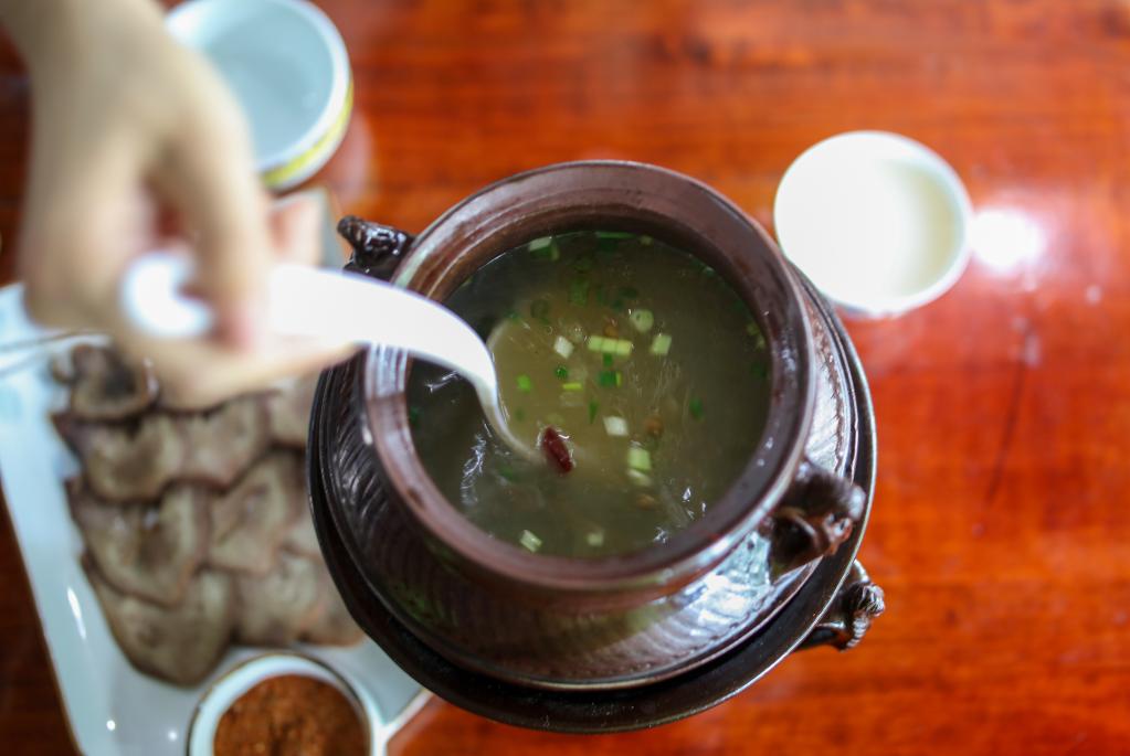 顧客在洛桑益西的餐館里從塔巴陶器罐子里盛湯(7月11日攝)。新華社記者 姜帆 攝